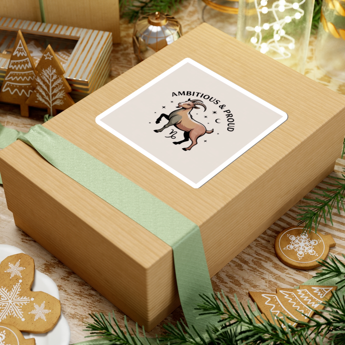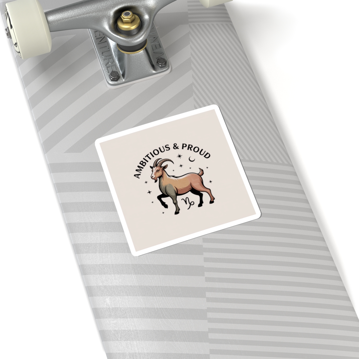 A clean, earthy Capricorn sticker pairing classic goat iconography with confident, straightforward typography. The artwork shows a stylized mountain-goat figure with subtle constellation dots and a small Capricorn glyph, set on a muted beige background to match the season’s grounded palette. Designed to sit neatly on laptops, journals, or water-resistant indoor surfaces, this kiss-cut vinyl sticker leans into Capricorn-season aesthetics—ambitious, steady, and quietly proud.